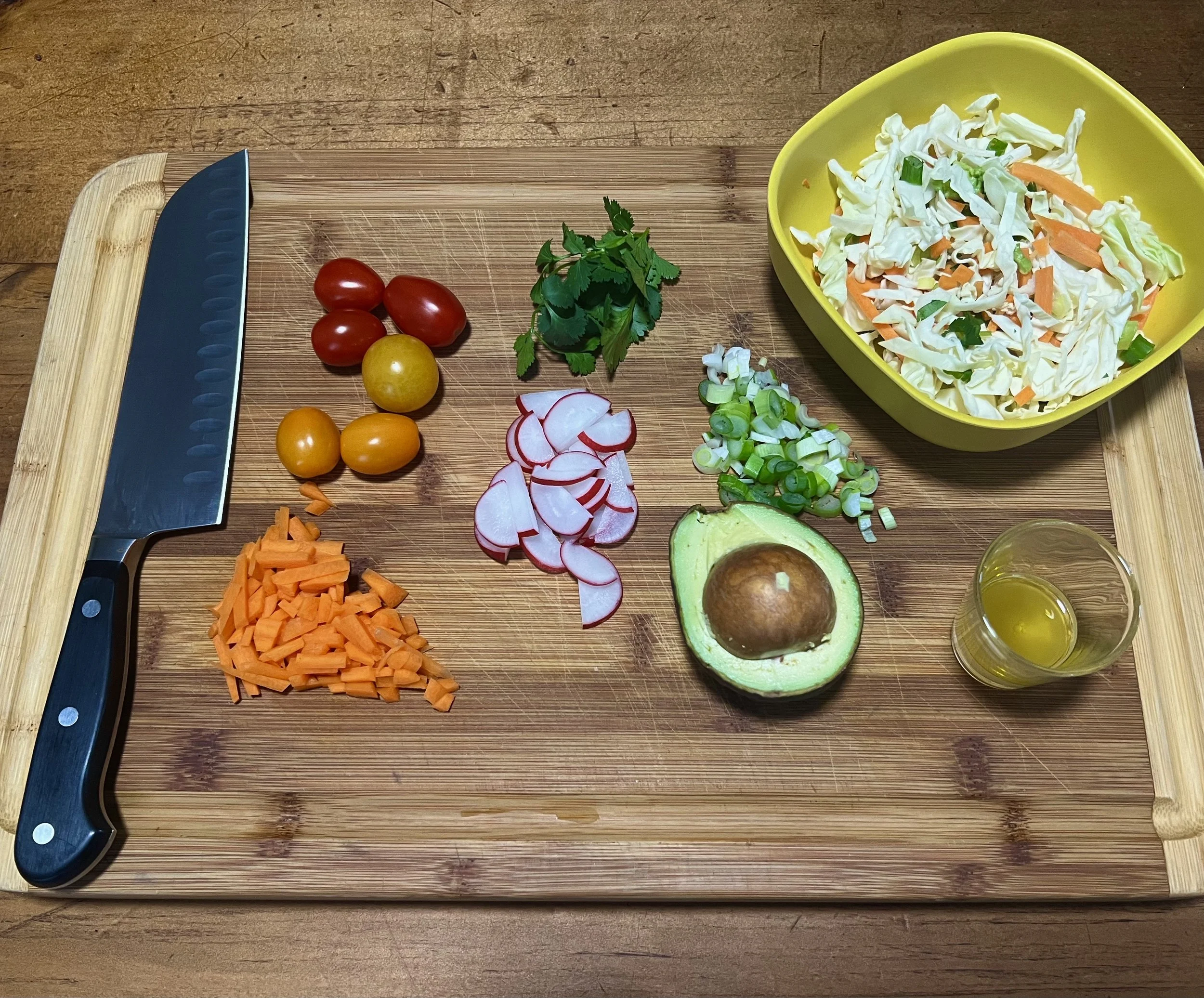 Place in 1 cup of slaw mix in a single serving bowl. Top with radishes, cherry tomatoes, scallions, and avocado. drizzle a mix of 1 Tablespoon of Acid League Meyer Lemon Honey Vinegar and 1 Tablespoon of extra virgin olive oil. Finish bowl with a Hard Boiled Egg. Finish with freshly grated Himalayan Sea Salt & Peppercorns to egg.