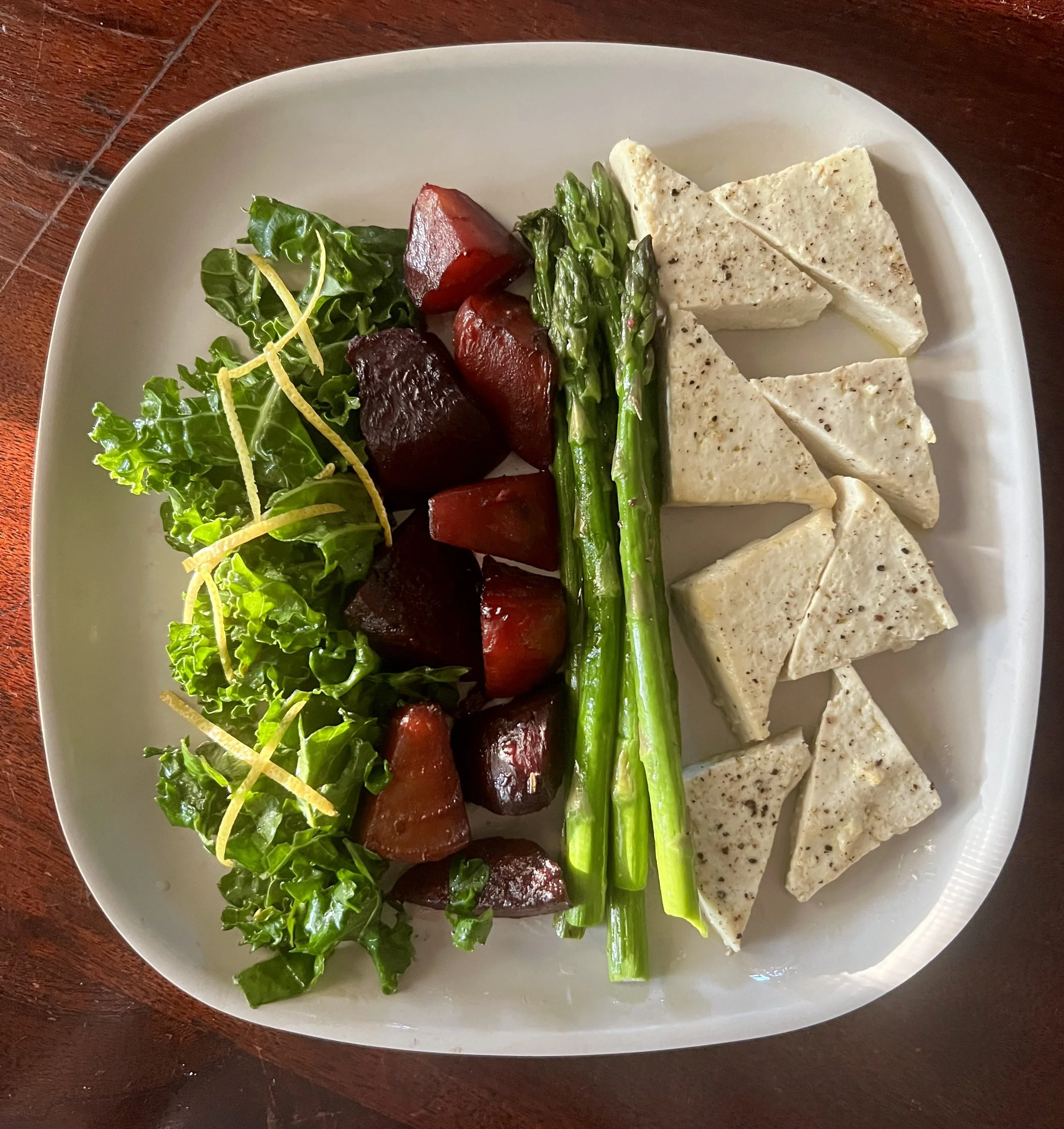 Composed Salad of Lemon Kale, Cherry Roasted Beats, Grilled Asparagus and Crispy Tofu